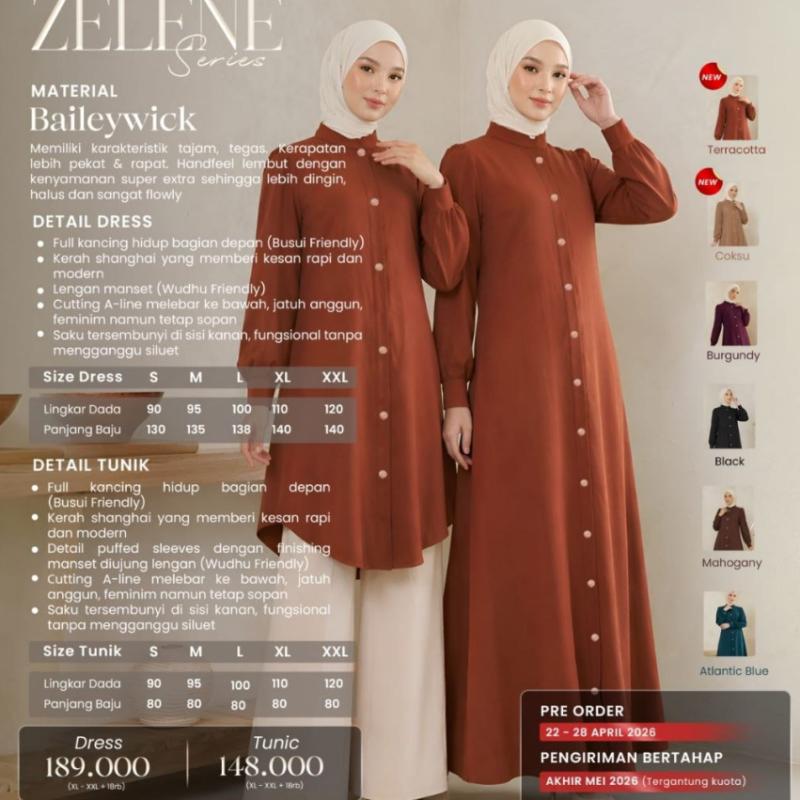 ZELENE SERIES (OPEN PO 22-28 APRIL 2026) Mewakili kamu yang ingin tampil kalem tapi tetap berkelas. Dengan siluet longgar dan detail kancing yang elegan, Zelene menghadirkan definisi baru dalam modest fashion *DETAIL DRESS* Material Baileywick, memiliki karakteristik tajam, tegas. Kerapatan lebih pekat & rapat. Handfeel lembut dengan kenyamanan super extra sehingga lebih dingin, halus dan sangat flowly Full kancing hidup bagian depan (Busui Friendly) Kerah shanghai yang memberi kesan rapi dan modern Lengan manset (Wudhu Friendly) Cutting A-line melebar ke bawah, jatuh anggun, feminim namun tetap sopan Saku tersembunyi di sisi kanan, fungsional tanpa mengganggu siluet *DETAIL TUNIK* Material Baileywick, memiliki karakteristik tajam, tegas. Kerapatan lebih pekat & rapat. Handfeel lembut dengan kenyamanan super extra sehingga lebih dingin, halus dan sangat flowly Full kancing hidup bagian depan (Busui Friendly) Kerah shanghai yang memberi kesan rapi dan modern Detail puffed sleeves dengan finishing manset diujung lengan (Wudhu Friendly) Cutting A-line melebar ke bawah, jatuh anggun, feminim namun tetap sopan Saku tersembunyi di sisi kanan, fungsional tanpa mengganggu siluet WARNA Atlantic Blue Black Burgundy Sage Mahogany Terracotta (New) Coksu (New) SIZE XS/M/L/XL/XXL HARGA - DRESS XS - L 189.000 XL - XXL + 18.000 - TUNIK XS - L 148.000 XL - XXL. + 18.000 NOTE : - Warna pada layar dan barang yang didapat bisa berbeda tergantung pencahayaan dan device yang dipakai - Perbedaan ukuran kurang lebih 3cm - Estimasi ready Mei 2026(tergantung kuota) - Minimal DP 50%, pembayaran DP maksimal H+2 setelah nota turun - Bagi yang tidak melakukan transaksi DP mohon maaf tidak diikutsertakan dalam list PO - 1 minggu sebelum barang ready akan diinfokan untuk diteruskan ke tim masing-masing - Pelunasan pembayaran H-7 saat barang ready