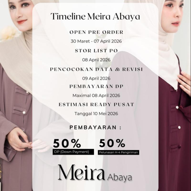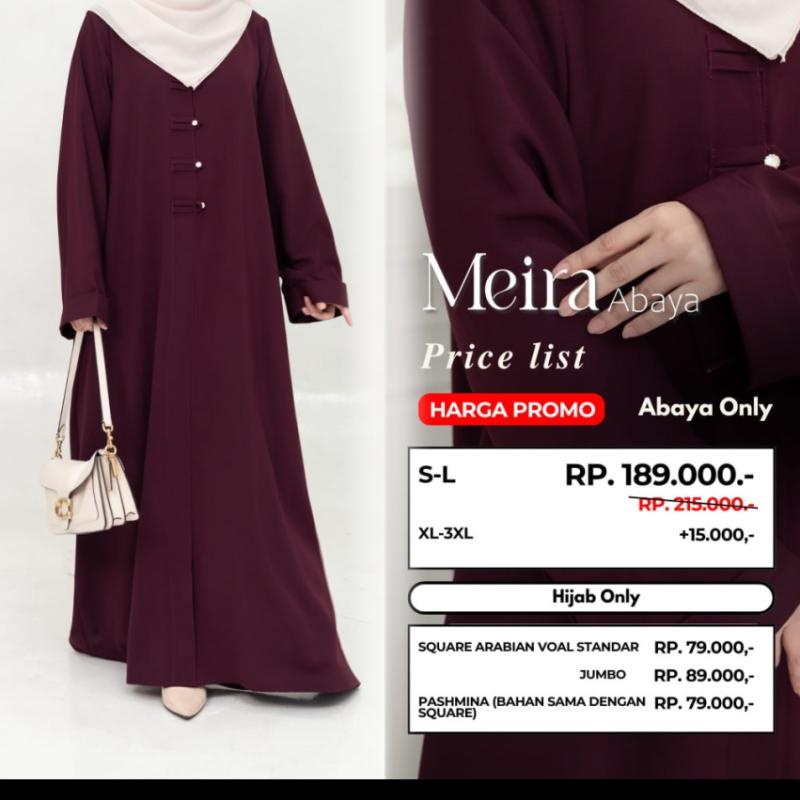 Bismillahirrahamannirrahim.. OPEN ORDER MEIRA ABAYA by SAZ Daily • 6 pilihan warna cantik ? MAHOGANY ? MAROON ? MAUVE ? BLACK ?GREY ? BRONZE GREEN Spesifikasi: Meira Abaya menggunakan bahan Sabrina ( Lembut, jatuh, adem, nyaman digunakan) * ?Cutting abaya loose super cantik * ?Bukaan kancing hidup bagiaan depan dengan aksen manis bisa untuk busui * ?Tangan loose ala abaya * Lipatan manset tangan membuatnya cantik dan manis Square dan pashmina hanya tersedia 1 warna (ivory) dengan bahan yang sama menggunakan bahan arabian voal. . . Notes : - Perbedaan size +-2cm karena cutting massal - ?Pembayaran DP 50% Keterangan size, harga ada di foto ya Dear?