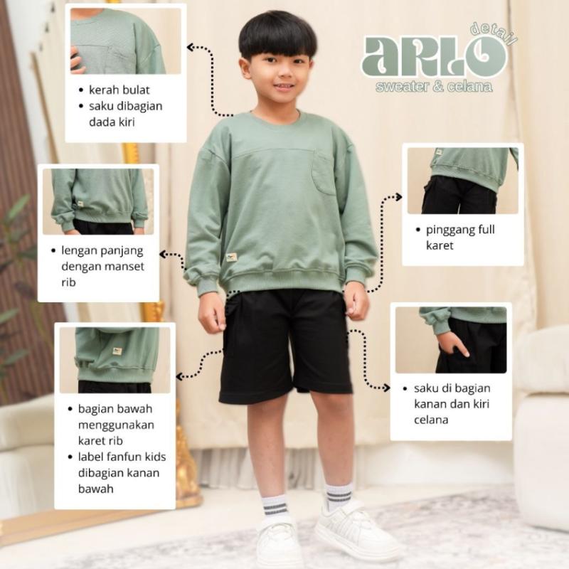 Bismillahirrahmanirrahim ARLO ? by Fanfun Kids Open PO 22 April - 2 Mei 2026 ARLO Koleksi terbaru dari fanfun kids sweater dan celana dengan desain simple cocok untuk suasana santai ataupun formal. MATERIAL Sweater menggunakan bahan Combad Baby Terry yang lembut, adem, dan menyerap keringat, sangat cocok bagi kenyamanan si kecil. Celana berbahan CVC Pique Hexagon yang memiliki permukaan berupa corak rajutan segi enam atau hexagon. Teksturnya lembut, halus, dan dapat menyerap keringat. ? PILIHAN WARNA SWEATER 1. Army 2. Black 3. Brown Bear 4. Copen 5. Navy 6. Topaz Green CELANA 1. Black 2. Misty Grey 3. Navy ? DETAIL SWEATER • Kerah bulat • Saku dibagian dada kiri • Lengan panjang dengan manset rib • Bagian bawah menggunakan karet rib • Label fanfun kids dibagian kanan bawah ? DETAIL CELANA • Pinggang full karet • Saku dibagian kanan dan kiri celana ? PRICELIST (Hemat 30.000) SWEATER • XS - M = 125.000 jadi 95.000 • L - 2XL = 135.000 jadi 105.000 CELANA • XS - M = 89.000 jadi 59.000 • L - 2XL = 99.000 jadi 69.000 ? SIZE CHART SIZE = LD / PB / PL / PC / EU • XS = 76 / 37 / 37 / 26 / 1-2 th • S = 80 / 39 / 39 / 28 / 3-4 th • M = 84 / 41 / 40 / 30 / 4-5 th • L = 88 / 43 / 41 / 32 / 6-7 th • XL = 92 / 45 / 42 / 34 / 7-8 th • 2XL = 96 / 47 / 44 / 36 / 8-9 th *LD : Lingkar Dada *PB : Panjang Badan *PL : Panjang Lengan *PC : Panjang Celana *EU : Estimasi Usia Jangan sampai ketinggalan PO produk premium by Fanfun Kids. ?DISCLAIMER • Toleransi size 1-2 cm • Terdapat perbedaan warna antara real dan gambar 5-10% yang disebabkan dari efek cahaya, kamera, dan layar hp masing-masing. #arlo #fanfunkids #sweateranak