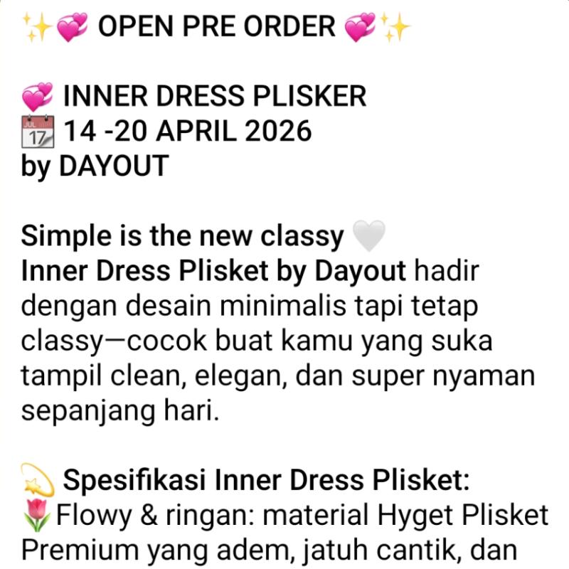 ?? OPEN PRE ORDER ?? ? INNER DRESS PLISKER ? 14 -20 APRIL 2026 by DAYOUT Simple is the new classy ? Inner Dress Plisket by Dayout hadir dengan desain minimalis tapi tetap classy—cocok buat kamu yang suka tampil clean, elegan, dan super nyaman sepanjang hari. ? Spesifikasi Inner Dress Plisket: ?Flowy & ringan: material Hyget Plisket Premium yang adem, jatuh cantik, dan nggak bikin gerah ?Plisket elegan: kasih efek ramping & stylish tanpa usaha berlebih ?Cutting simpel tapi mewah: cocok dipakai santai sampai semi-formal ?Super fleksibel: bisa dipakai sendiri atau jadi inner outfit favorit kamu ?Detail ukuran LD : 110cm, Panjang Dress : 135cm. Fit dari S sampai XL (estimasi toleransi 2–4 cm) ? Referensi Mix & Match: - Tambahin outer cardigan rajut + flat shoes ? look girly santai - Pakai belt kecil + heels ? langsung jadi semi-formal chic - Layer sama blazer ? cocok buat kerja atau meeting ? Price : Rp 130.000 One dress, banyak gaya. Worth it banget! Follow kami di ?? Instagram: @day.outfit__ Telegram: https://t.me/dayoutpusatofficial #dailydress #dresscantik #ootdhits #fashionhijab #outfitinspo #wanitastyle #dresssimple #lookelegant #trendfashion Thank You and Happy Shopping ^_^??