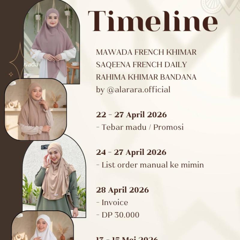 Bismillah *MAWADA FRENCH KHIMAR* By @alarara.official Mawada french adalah inovasi terbaru dari jilbab makutha. Menjawab pertanyaan emak-emak yang pengen jilbab makutha tapi lebih SATSETT!! dan auto cantik tentunya ? SPESIFIKASI ? Basic material ceruty babydoll armany yang ringan, lembut, dan nyaman dipakai ? Desain cantik dan simple auto langsung rapi dengan ukuran 130x130 cm ? Finishing jahit tepi rapi ? Terdapat tali kanan kiri untuk menjadi khimar instan ? Double layer sehingga tidak nerawang ? Tersedia 6 warna cantik : Plum | Fosil | Mahogani | Beige | Black | White ? Instruksi : - Cuci dengan tangan - ?Sebaiknya tidak dicuci dimesin cuci - ?Disetrika tidak dengan suhu terlalu panas ? BEST PRICE : Harga normal : ~119.000~ Harga promo : 79.000 DISCLAIMER ? Toleransi size produk ini ± 2Cm ? Terdapat perbedaan warna antara foto dengan warna asli 80 - 100 % karena faktor pencahayaan pemotretan dan tergantung pada resolusi monitor / hp ? Pencucian produk baru harap dipisah 1-2 pencucian dengan pakaian lama Bismillah *RAHIMA KHIMAR BANDANA ZIPPER* By @alarara.official Rahima Khimar adalah inovasi terbaru dari jilbab makutha. Menjawab pertanyaan emak-emak yang pengen jilbab makutha tapi lebih SATSETT!! dan auto cantik tentunya ? SPESIFIKASI ? Basic material ceruty babydoll armany yang ringan, lembut, dan nyaman dipakai ? Desain cantik dan simple auto langsung rapi ? Size chart : - Panjang depan 73cm - ?Panjang belakang 120cm - ?Lingkar kepala 30cm ? Penggunaan rahima khimar bandana bisa 2 look. Look tali luar dan look tali dalam ? Double layer sehingga tidak nerawang ? Tersedia 6 warna cantik : Plum | Fosil | Mahogani | Beige | Black | White ? Instruksi : - Cuci dengan tangan - ?Sebaiknya tidak dicuci dimesin cuci - ?Disetrika tidak dengan suhu terlalu panas ? BEST PRICE : Harga normal : ~129.000~ Harga promo : 89.000 DISCLAIMER ? Toleransi size produk ini ± 2Cm ? Terdapat perbedaan warna antara foto dengan warna asli 80 - 100 % karena faktor pencahayaan pemotretan dan tergantung pada resolusi monitor / hp ? Pencucian produk baru harap dipisah 1-2 pencucian dengan pakaian lama Bismillah *SAQEENA FRENCH DAILY* French Hijab Daily By @alarara.official Saqeena french menjawab pertanyaan emak-emak yang selalu ingin tampil trendy tapi nyaman dipakai sehari-hari. Saqeena juga satseett anti ribet, serta bisa dipakai dengan 2 Look cantik!! SPESIFIKASI ? Basic material Jersey Premium yang ringan, lembut, dan nyaman dipakai ? Desain cantik, jika dipakai AUTO CANTIK dan langsung rapi ? Dilengkapi dengan masker/cadar yang bisa di adjust ? Terdapat 2 tali - Tali besar : bisa di adjust tali diluar atau tali didalam - ?Tali kecil : untuk mengencangkan bagian masker/cadar ? Finishing dengan jahit tepi rapi ? Tersedia 10 warna cantik : Black | Mocca | Coksu | Navy | Darkgrey | Skygrey | Maroon | Dupink | Coffee | White ? Ukuran : - Allsize Panjang Depan : ± 77 cm Panjang Belakang : ± 100 cm ? Instruksi : - Cuci dengan tangan - ?Sebaiknya tidak dicuci dimesin cuci - ?Disetrika tidak dengan suhu terlalu panas ? BEST PRICE : Harga normal : ~89.000~ Harga promo : 69.000 DISCLAIMER ? Toleransi size produk ini ± 2Cm ? Terdapat perbedaan warna antara foto dengan warna asli 80 - 100 % karena faktor pencahayaan pemotretan dan tergantung pada resolusi monitor / hp ? Pencucian produk baru harap dipisah 1-2 pencucian dengan pakaian lama