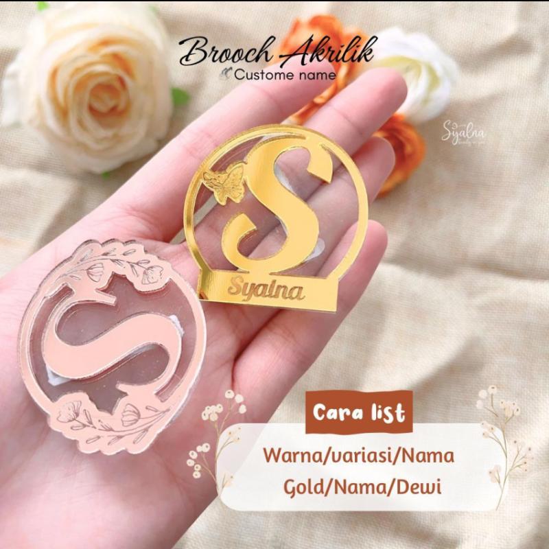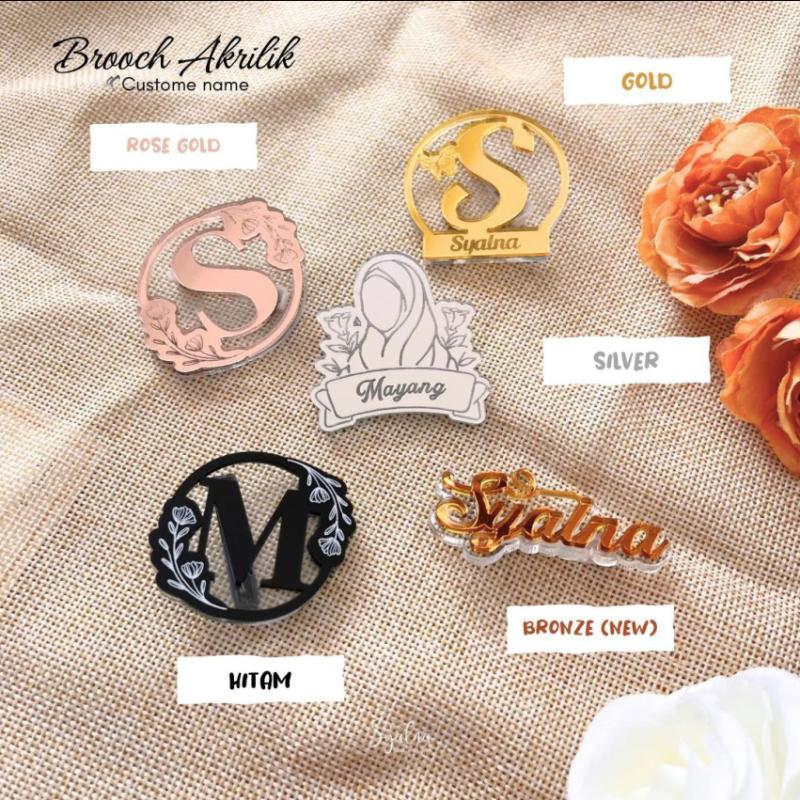 Bismillah... Hai Hai Momslimah, Hayooo ada yang kangen Brooch Custome Name dari Syalna?? ? Karena banyaknya permintaan, kini brooch cantik yang sudah terjual 20.000pcs++ hadir dengan warna, design baru dan acrylic yang lebih tebel loh? *Brooch Akrilik Custome Name* Terbuat dari bahan akrilik double layer yang kokoh dan tahan lama, warna tidak mudah luntur dan ukuran yang menyesuaikan. Dan yang paling uniknya bisa CUSTOME NAME tanpa biaya tambahan loh? Intip Spesifikasinya yuk?? SPESIFIKASI ? Terbuat dari Akrilik gold premium ? CUSTOME NAME (Hanya 1 kata) tanpa tambahan biaya ? Bahannya ringan, double layer (tidak mudah patah) ? Detail mirror mengkilap  yang menambah kesan elegant ? Ketebalan 5mm (double layer) ? Peniti berkualitas anti umpul ? Dilapisi pelindung akrilik ? Lasser Cutting/Lasser Engraving ? Packaging plastik OPP dan card ? Size Chart : - Nama L 5,5cm x T 2,4cm (tergantung panjang nama) - Lingkaran diameter 3cm - Siluet  L 4cm ? Pilihan warna : Bronze (NEW), Gold, Rose gold, Silver dan Hitam ? Variasi  Brooch : - Lingkaran Inisial - Lingkaran Nama - Siluet - Nama ? Cara list : Warna / Variasi / Nama ? Best Price : Rp. 35.000 Warnai hijab cantikmu dengan Brooch Custome Name dari Syalna?