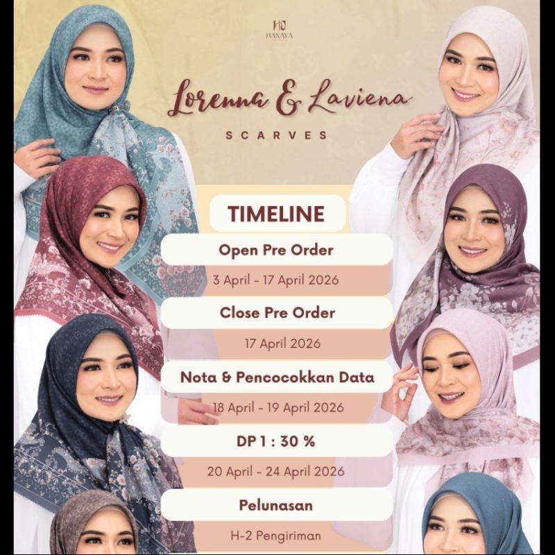 LORENNA & LAVIENA SERIES Periode PO : 3 - 17 April 2026 Estimasi Ready : H+10 setelah terbit nota DP PO : 30% Deskripsi Produk : Menggunakan material voal premium HQ_Hanaya Signature yang memiliki karakteristik halus lembut dan mudah diatur finishing lasercut Available 12 Warna Laviena: • Milk • ?Charcoal • ?Magenta • Lilac • ?Teal • ?Pinkish Lorenna: • Wine • ?Olive • ?Midnight • ?Turqoise • Pine • ?Denim Pricelist : _Promo Launching Only size 110x110 ?? Rp 100.000 get 3 pcs_ Size 115x115 ?? Rp 45.000/pcs Size 130x130 ?? Rp 50.000/pcs Get your style with @hanayasignature_
