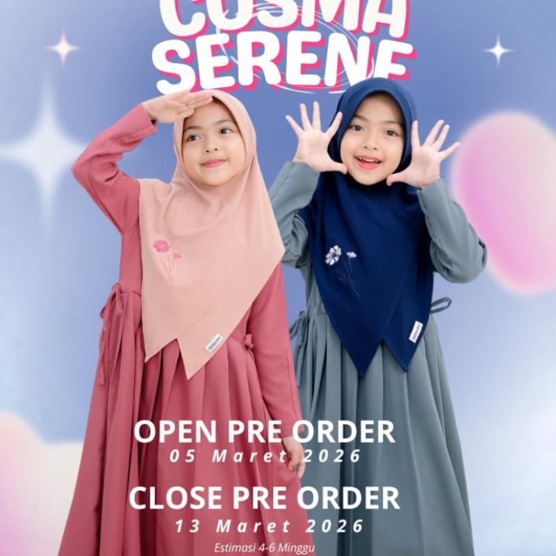OPEN PRE-ORDER 05 MARET - 13 MARET 2026 SERENE DRESS KIDS X COSMA KIDS Special collaborations Azamka X Nabihakids MasyaAllah sekian lama akhirnya hadir juga...Yang sering tanyai kapan ada dress kids yang lucu di padukan dengan Cosma yang cantik ?... Azamka X nabihakids mempersembahkan kolaborasi yang epic tentu si kecil semakin cantik dan manis? Detail Dress : ? Menggunakan material Soft crepe premium,nyaman,flowly dan yang pasti anti gerah ? Di design cantik Denga tali pinggang yang bisa di serut samping kanan kiri ? Terdapat resleting di bagin dada ? Lengan panjang dengan potongan lurus memberikan kesan anggun ? Knife pleats lipan Searah rapi dan garis lurus di bagian pinggir melingkar ke bawah sehingga look lebih menawan ? Detail Hijab : ? Menggunakan material Jersey high twist parfum premium, sudah pasti wangi,adem ? Terdapat logo bordiran bunga Cosmos di bagian depan ? Pad antem dan logo bordir khas Azamka ? Cutting oval ? Ukuran PD : 62Cm PB : 67Cm Dress dan hijab secakep ini sayang banget jika di lewatin gitu ajah?