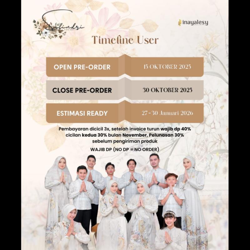 inayalesy mempersembahkan Salindri Family Sarimbit, Satu Keluarga, Satu Keanggunan, Satu Kenangan Abadi di Hari Raya. Saat gema takbir menggema di langit Idul Fitri, kita tak hanya merayakan kemenangan—kita merayakan keanggunan cinta, kehangatan keluarga, dan kenangan yang mekar abadi dalam menyambut keberkahan. Inayalesy dengan bangga mempersembahkan SALINDRI Family Sarimbit, koleksi eksklusif untuk Idul Fitri 2026. Terinspirasi dari keindahan taman bunga klasik di bawah cahaya rembulan, koleksi ini merefleksikan kekuatan cinta yang membingkai setiap langkah, setiap senyuman, dan setiap momen penuh makna yang tak ingin dilupakan. Hari Raya hanya datang sekali setahun. Momen yang istimewa ini layak dirayakan dengan penampilan terbaik tanpa repot, tanpa khawatir. Salindri Family Sarimbit lahir dari rancangan eksklusif tim Inayalesy Group. Mulai dari pola desain yang orisinal, motif yang tak akan kamu temukan di pasaran, hingga pemilihan material berkualitas tinggi yang nyaman sekaligus memancarkan kemewahan. Semua melalui proses yang terkontrol penuh dari awal hingga akhir. Dijahit langsung di fasilitas produksi milik Inayalesy Group, setiap helai busana dikerjakan oleh tangan-tangan ahli yang telah berpengalaman membuat puluhan ribu sarimbit keluarga. Kami mengerti bahwa kualitas, detail, dan ketepatan waktu bukan sekadar janji — tapi komitmen. Pesanan kamu akan selesai sesuai rencana, tanpa drama di menit terakhir. Ingin Lebaran 2026 terasa lebih berkesan? Salindri Family Sarimbit bukan sekadar pakaian, melainkan simbol kebersamaan dan kemewahan yang akan tersimpan dalam kenangan keluarga selamanya. Scarf Salindri hadir sebagai pelengkap sempurna untuk setiap dress dalam koleksi ini. Didesain dengan bahan voal premium yang ringan dan jatuh anggun, scarf ini menghadirkan harmoni indah dari ujung kepala hingga ujung langkah. Motif khas Salindri yang mewah dipadukan dengan pin logo eksklusif, menjadikannya lebih dari sekadar aksesoris—ia adalah detail yang menyempurnakan penampilanmu. Setiap helainya memantulkan cerita tentang keanggunan, kelembutan, dan keserasian yang dirayakan bersama keluarga Khimar Salindri adalah simbol kelembutan yang memeluk dengan anggun. Terbuat dari Cherry light siffon yang ringan dan flowy, khimar ini memberikan kesan jatuh yang elegan serta kenyamanan maksimal sepanjang hari. Motif Salindri pada khimar ini selaras dengan koleksi dress, menciptakan harmoni sempurna dari ujung kepala hingga kaki. Logo tag eksklusif menjadi tanda kemewahan dalam detail, menjadikan khimar ini pilihan tepat bagi perempuan yang ingin tampil anggun, syar’i, dan modern dalam satu sentuhan. BROWN menghadirkan pesona klasik dan membumi, simbol dari fondasi keluarga yang kokoh dan penuh kelembutan. EMERALD memancarkan aura kemewahan yang segar dan megah, pilihan bagi jiwa yang berani tampil menawan. NAVY adalah simbol ketenangan dan kebijaksanaan, pilihan klasik yang tak lekang oleh waktu. BURGUNDY merepresentasikan romansa, keberanian, dan kemewahan yang kaya, meninggalkan kesan yang tak terlupakan. WHITE memancarkan cahaya kemurnian dan ketulusan, pilihan suci untuk merayakan awal yang baru. TAUPE adalah pilihan unik bagi keluarga yang menghargai keindahan yang tenang dan sophisticated. Hasil pencahayaan mempengaruhi tampilan foto & vidio Toleransi Perbedaan warna kurang lebih 10 – 20% Kepekatan warna satu baju dengan yang lain nya bisa saja ada perbedaan seulas karena proses celup warna yang bertahap Noda-noda kapur jahit ataupun kotoran yang dapat di cuci tidak termasuk reject Toleransi 2-3 cm antara size chart dengan ukuran sebenarnya karena proses pemotongan massal Motif mungkin akan mengalami perbedaan karena proses pemotongan massal Batas waktu RETURN produk adalah Maksimal 2 minggu setelah produk didistribusikan