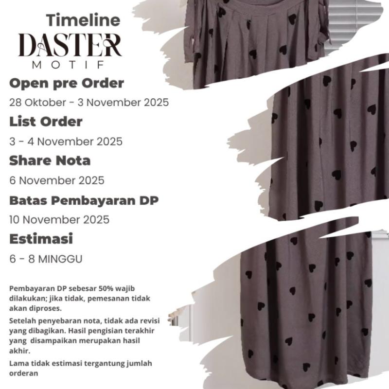 OPEN PRE ORDER ?DASTER MOTIF ? 28 OKTOBER - 3 NOVEMBER 2025 by Dayout Hadirkan kenyamanan dan keanggunan dalam keseharianmu dengan Daster Motif!. Daster motif terbuat dari bahan rayon premium halus, lembut, dan nyaman digunakan untuk sehari-hari, baik saat bersantai maupun beraktivitas. Daster motif di lengkapi dengan tali lepas pasang yang bisa di adjust. Daster motif adalah Dress rumahan yang di desain simpel namun tetap memberikan sentuhan manis.? ?Size Chart : - XXL : LD 120cm, P 110cm, BB 40-85kg - 4L : LD 140cm, P 110cm, BB 85-120kg ?Price: Rp95.000 Tampil cantik dan nyaman di rumah kini lebih mudah dengan Daster Motif! Yuk, segera miliki sebelum kehabisan!?? Follow kami di ?? Instagram: @day.outfit__ Telegram: https://t.me/dayoutpusatofficial #DayOutfit #DasterSimple #DasterNyaman #DasterRumahan #DasterRayon #DasterLekbong #DasterYukesi #DasterMotif #ComfortableAndChic #DayOutStyle #IbuMenyusui #EffortlessFashion Thank you and Happy Shopping ^_^??
