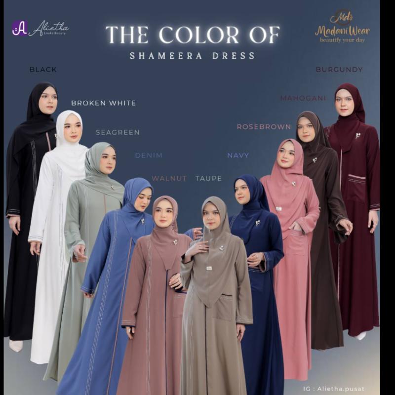 Bismillahirrahmanirrahim Shameera Series by. Madani When Comfort meets style, simple but statement!! Spesifikasi Dress ? Material Marina Silk Anti UV ? Free Broch untuk setiap pembelian dress ? Adem dan Ringan ? Zipper bagian depan ? Pocket aktif sisi kiri ? Wudhu Friendly ? Busui Friendly ? Jahitan timbul panjang sisi kanan ? Jahitan timbul bagian rib tangan ? List coklat bagian rib dan depan ? Cuttingan A line dan drop shoulder ? Terdapat 10 Warna cantik ? Ukuran XXXS bisa mulai dari 7 tahun SPESIFIKASI HIJAB ?Pashmina 75cm x 180cm ?Square 115cm x 115cm ?Khimar (Panjang depan 90cm Panjang belakang 120cm) 10 WARNA SHAMEERA DRESS ? Black ? Denim ? Burgundy ? Walnut ? Rosebrown ? Seagreen ? Broken White ? Taupe ? Mahogani ? Navy ? Size Chart dan Pricelist sesuai flyer Cek katalog lengkap di https://t.me/madaniwearpusat Noted ? On Model wanita pakai gamis size L ? Berat Gamis -/+ 650grm