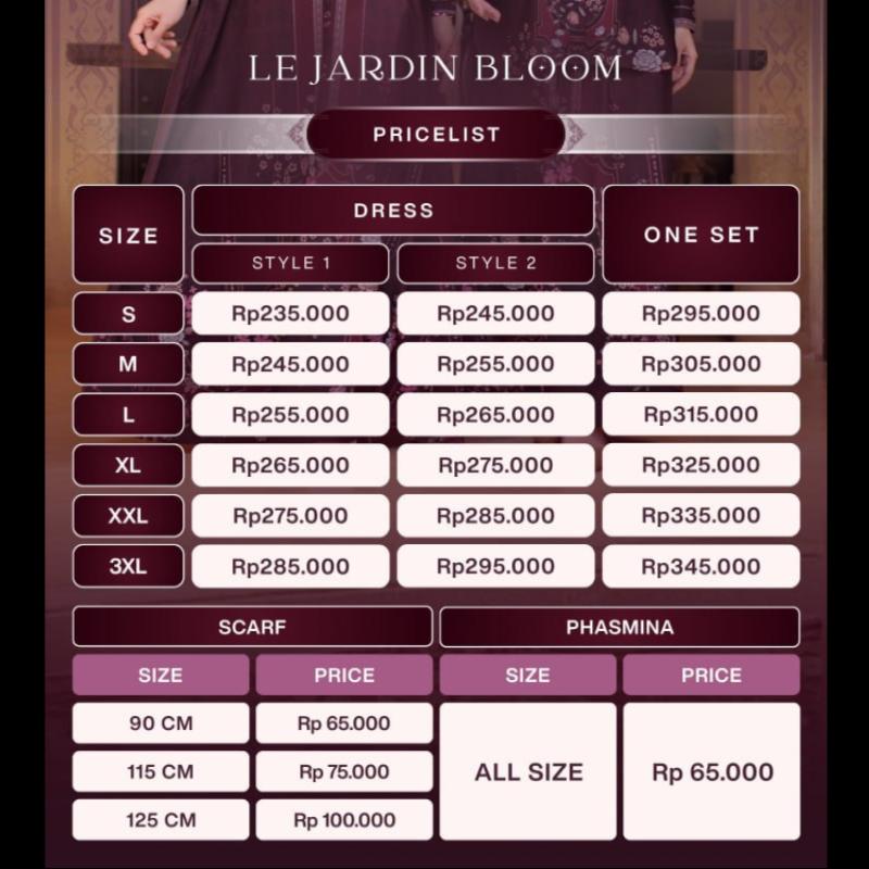 LEE JARDIN BLOOM Series terkahir dari @hunnylabel yang akan ready sebelum lebaran ? Pre Order : 30 Maret - 13 April 2026 A celebration of beauty, growth, and timeless femininity LEE JARDIN BLOOM hadir sebagai koleksi terkahir yang terinspirasi dari keindahan bunga yang sedang mekar. Setiap helai motifnya dirancang exclusive dan setiap detail motifnya memberikan kesan elegan mewah ? Menghadirkan tone warna yang halus dan mewah , menggunakan material yang pasti adem dan nyaman “Royal Twill Cotton“ ciri khas produk @hunnylabel yang selalu menyuguhkan cotton material , komposisi material katun dan polyester yang menghasilkan handfeel halus flowly dan nyaman digunakan Deskripsi : DRESS STYLE 1 ~ Menggunakan material Royal Twill Cotton printing HQ ~ Handfeel halus lembut dan adem dijamin nyaman ~ Menggunakan kerah sanghai ~ Zipper depan busui friendly ~ Cutting lose abaya ~ Saku samping kanan ~ Manset tangan basic kancing satu ~ Motif dress dengan ciri khas seamless yang mewah DRESS STYLE 2 : ~ Menggunakan material Royal Twill Cotton printing HQ ~ Handfeel halus lembut dan adem dijamin nyaman ~ Menggunakan kerah sanghai ~ Zipper depan busui friendly ~ Cutting lose abaya ~ Saku samping kanan ~ Manset tangan basic kancing satu ~ Terdapat cutting rampel di bagian rok ~ Motif dress dengan ciri khas seamless yang mewah ONE SET : ~ Menggunakan material Royal Twill Cotton printing HQ ~ Handfeel halus lembut dan adem dijamin nyaman ~ Menggunakan kerah kemeja ~ Kancing hidup full hidden ~ Cutting blouse reguler fit ~ Rok dengan full karet di bagian pinggang ~ Saku samping kanan pada rok SCRAFT : ~ Menggunakan voal HN Premium printing ~ Finishing lasercut ~ Available ukuran 115cm & 120cm PHASMINA : ~ Menggunakan material Cerutty Babydoll HQ ~ Finishing jahit tepi ~ All size ukuran 72cm x 180 cm Tersedia 6 ukuran : S|M|L|XL|XXL|3XL Terdapat 5 Pilihan Warna : * Noire * ?Crystal * ?Snowy * ?Blouevrn * ?Sorellia Pricelist : Tabel Terpisah ? Let your beauty bloom gracefully with LEE JARDIN BLOOM. Koleksi yang tidak hanya dikenakan, tetapi nyaman dirasakan ?
