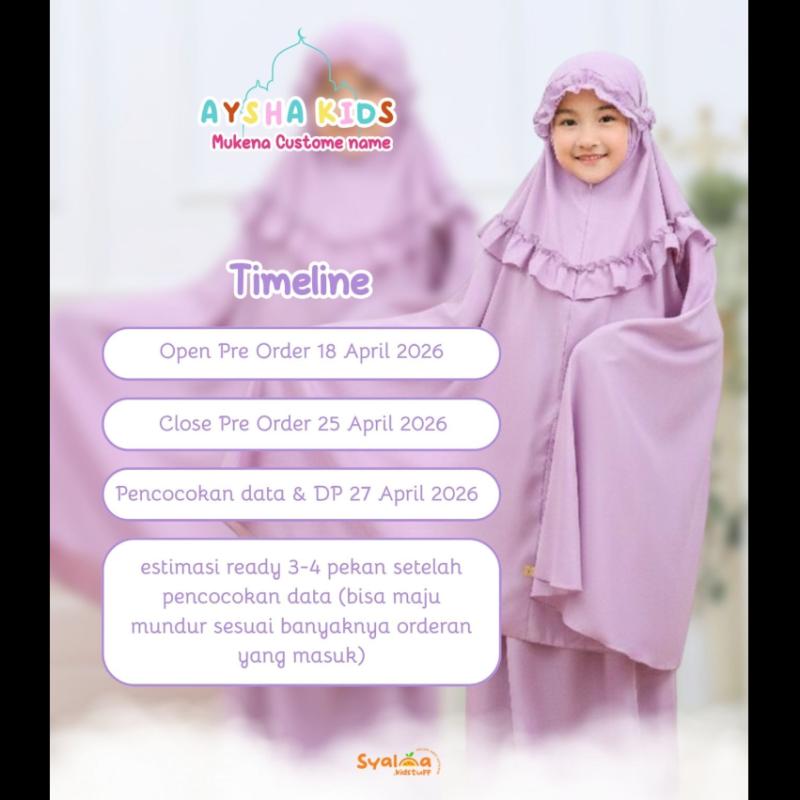 Bismillah... Haihai momslimah, Untuk menemani Hari Raya Idul Adha nanti, mukena gemas dari Syalna.Kidstuff kini hadir kembali loh? Proudly Present, *Aysha Kids Mukena Custome Name Batch 2* Mukena gemas yang didesign khusus untuk menemani moment ibadah si kecil di hari yang suci dengan nyaman, lembut dan penuh cinta? SPESIFIKASI ? Mukena terbuat dari material Katun ? Free Tas Custome Name, full printing dengan bahan parasut crinkle ? Mukena bisa di style 2in1 ? Terdapat tali adjustable di bagian dagu ? Terdapat ruffle cantik di bagian dada ? Terdapat aksen ruffle di bagian wajah yang menyambung dengan tali ? Finishing mukena dengan jahit tepi kecil ? Pilihan warna yang cerah cocok untuk anak anak ? Tedapat 3 pilihan size S-L ? Terdapat 5 pilihan warna : Rasphberry, Matcha, Dusty Purple, Sky blue dan Lilac ? Best Price : - Size S Rp. 149.000 - Size M Rp. 159.000 - Size L Rp. 169.000 *Khusus Open Pre-Order kali ini ada free 1pcs mukena bebas pilih disetiap pembelian 50pcs (berlaku kelipatan)* _ Disclaimer : - Kemiripan warna 90-95% hal ini dikarenakan lighting dan resolusi gambar pada masing-masing gadget - Toleransi ukuran 2-3cm dikarenakan cutting massal