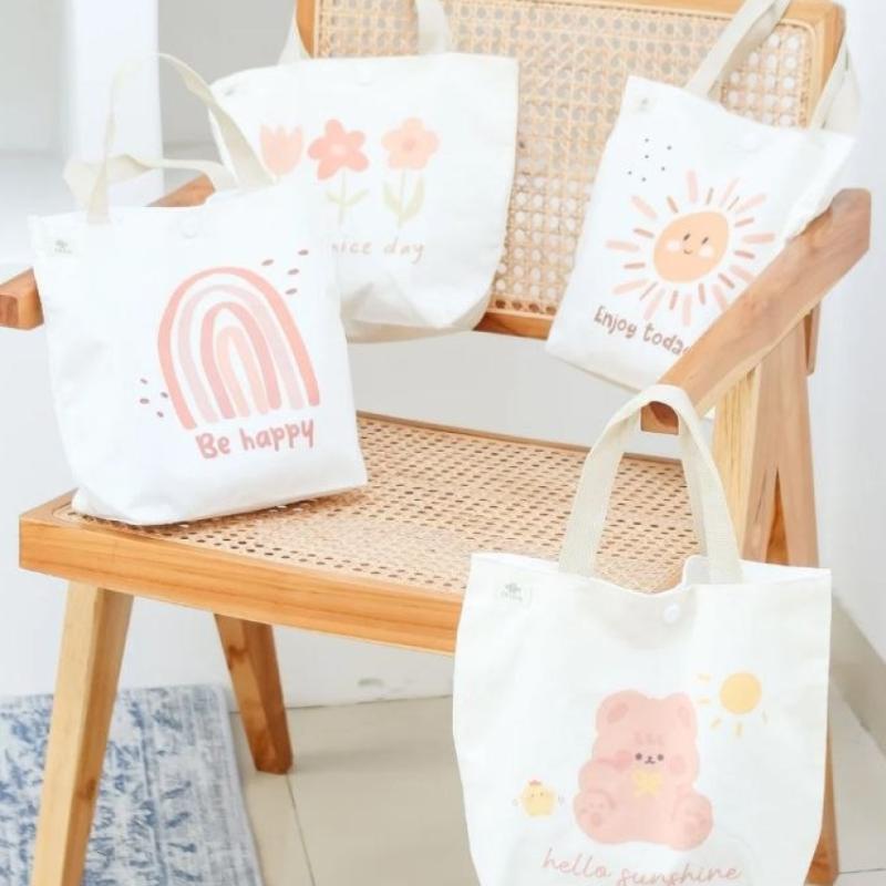 SPESIFIKASI WINIE TOTE BAG by ZELOIS Material : Kanvas Detail : ?Lapisan dalam menggunakan puring spunbond / Katun putih ?Tali jinjing Polyester ?Printing 1 sisi ?menggunakan Kancing catet ?Label Zelois di bagian depan 4 Pilihan Motif ? Beruang ? Matahari ? Pelangi ? Flowers Size ?30 x 10 x 25 ?BISA CUSTOME NAMA dengan 2 Opsi : ? Motif dan Nama ? Only Nama price : 65.000
