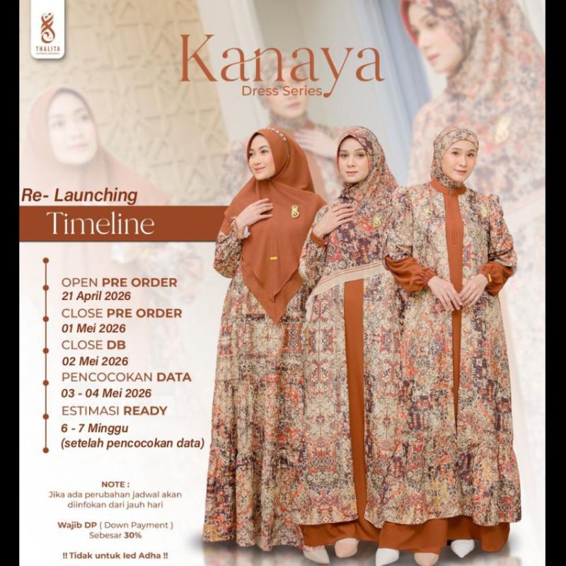 Bismillahirrahmanirrahim... Khairani x Thalita Re-Launch Mari rayakan moment spesial bersama *KANAYA - DRESS SERIES* semoga kamu dapat warna incaran kamu yaaa .. ? ? Open Launching 21 April - 01 Mei 2026 _??? COLOUR CHART_ 1. Creamy Vanila 2. Black Cavier 3. White Pearl 4. Twilight Blue 5. Rust Coral _??? MATERIAL PRODUK_ ? Material Khimar : Cerruty Premium Babydol * Lembut, jatuh, ringan, dan memiliki karakteristik yang flowly banget jadi nyaman banget saat dipakai ? Material Scarft : Voal Premium (Trispan) * Memiliki karakteristik permukaan yang halus, ringan tidak kaku dan mudah menyerap keringat, jadi cocok dipakai saat cuaca apapun ? Material Dress : Elizabeth Twill Motif Printing * Elizabeth Twill : Kategori twill yang berserat diagonal. Bahannya ringan, flowly, adem dan menyerap keringat dengan baik dan tidak terawang dengan kwalitas premium yang super istimewah ketika dipakai _??? DETAIL PRODUK_ Motif Printing Original Signature by Thalita : Proses pemberian warna atau motifnya dilakukan dengan cara membuat cetakan atau design motif yang diinginkan. Diatas kain mentah terdapat logo brand pada corak kainnya. Finishing printing sedikit mengkilap sehingga terlihat lebih mewah dan berkelas. ? Dress Style 1 (DIVA) - Model anggun, simple & elegant - Model kerah bulat dengan resleting bagian depan (busui friendly ) - Terdapat jaitan dibagian susun-susun gamis, pada bagian manset lengan (wudhu friendly) dengan model lengan karet terompet. Dan terdapat logo akrilic Thalita - Saku bagian kanan dress ? Dress Style 2 (VANIA) - Desain outer bagian depan dijahit menyatu dengan dress - Model kerah shanghai dengan resleting bagian depan (busui friendly) - Terdapat aksen lipit bagian atas gamis sehingga menambah kesan manis dan cantik - Manset tangan karet, simple dan cantik - Lengan manset kancing, dilengkapi akrilik brand (wudhu friendly) - Model layernya nyatu dengan gamis ? Dress Style 3 (ANDIT) * Desain outer bagian depan dijait menyatu dengan dress * Kerah shanghai dengan resleting bagian depan (busui friendly) * Manset lengan kacing dengan pemanis akrilik thalita (wudhu friendy) ? Khimar Polos & Khimar Printing - Khimar pad anthem - Akrilik di bagian depan khimar polos - Model khimar polos 2 layer - Khimar printing model belah tengah sehingga bisa disesuaikan style yang dimau ya karena belah tengah - Padnya super nyaman banget dan bikin pipi kamu auto tirus _??? SIZE CHART_ > Dress LD 92 PB 134 PL 58 S LD 96 PB 136 PL 59 M LD 100 PB 140 PL 60 L LD 110 PB 140 PL 60 XL LD 120 PB 142 PL 60 XXL LD 130 PB 142 PL 60 XXXL > Khimar Polos - Panjang Depan 87 - Panjang Belakang 138 > Khimar Printing (Segi 4 Instan) - Panjang Depan 104 - Panjang Belakang 116 > Scarft Printing - 110 x 110 - 120 x 120 - 140 x 140 _??? PRICELIST_ ? Dress Style 1 Rp. 298.000 S Rp. 308.000 M Rp. 318.000 L Rp. 328.000 XL Rp. 338.000 XXL Rp. 348.000 XXXL ? Dress Style 2 Rp. 308.000 S Rp. 318.000 M Rp. 328.000 L Rp. 338.000 XL Rp. 348.000 XXL Rp. 358.000 XXXL ? Dress Style 3 Rp. 308.000 S Rp. 318.000 M Rp. 328.000 L Rp. 338.000 XL Rp. 348.000 XXL Rp. 358.000 XXXL ? Khimar Only Rp. 128.000 Khimar Polos Rp. 198.000 Khimar Printing / Segi 4 Instan ? Scarft Only Rp. 109.000 Size 110 x 110 Rp. 129.000 Size 120 x 120 Rp. 139.000 Size 140 x 140 ? Req size +25.000 (Harga dihitung setelah diskon) *Noted :* * Size dress disarankan untuk mengukur terlebih dahulu sebelum melakukan list * Hasil pencahayaan pada saat pemotretan & perbedaan resolusi pada hp/laptop/komputer akan mempengaruhi hasil tampilan foto katalog 80% kemiripan * Produksi massal toleransi pada jahitan ±1-2cm * Noda kapur bukan reject