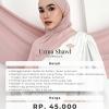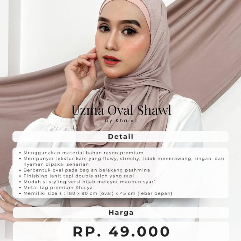 Hallo Khailove ? Uzma Shawl Pashmina Oval by Khaiya kini hadir menemani hari-harimu. Uzma Shawl Pashmina Oval merupakan pashmina kaos rayon premium yang berbentuk oval pada bagian belakang. Memiliki karakteristik flowy, strechy, dan mudah di styling mleyot maupun syar’i. FREE : MINI PIN BROS SETIAP PEMBELIAN UZMA SHAWL PASHMINA OVAL Detail spesifikasi Uzma Shawl Pashmina Oval: - Menggunakan material bahan rayon premium - ?Mempunyai tekstur kain yang flowy, strechy, tidak menerawang, ringan, dan nyaman dipakai seharian - Berbentuk oval pada bagian belakang pashmina - ?Finishing jahit tepi double stitch yang rapi - ?Mudah di styling versi hijab meleyot maupun syar’i - ?Metal tag premium Khaiya - ?Memiliki size : 180cm x 90 cm (Oval) x 45 cm (Lebar Depan) - Estimasi berat : 200 gr Terdapat 15 (Lima belas) pilihan warna, antara lain : ?? Burgundy ?? Silver ?? Ocean ?? Rose ?? Seagreen ?? Black ?? Taupe ?? Latte ?? Mahogany ?? Choco ?? Espresso ?? Cream ?? Abalone ?? Tan ?? Broken White BEST PRICE : Rp49.000 Yukk langsung ikutan PO Uzma Shawl Pashmina Oval ke Mitra Khaiya terdekat di kotamu yaaa ? ?Note dan Disclaimer? - Warna pada gambar akan sedikit berbeda 10-20% karena proses photoshoot atau pencahayaan pada HP masing-masing - ?Toleransi size chart kurleb 2-3 cm karena proses produksi (cutting dan jahit) ... Hallo Khailove ? Uzma Shawl by Khaiya kini hadir menemani hari-harimu. Uzma Shawl merupakan pashmina kaos rayon premium yang flowy, strechy, dan mudah di styling mleyot maupun syar’i. FREE : MINI PIN BROS SETIAP PEMBELIAN UZMA SHAWL Detail spesifikasi Uzma Shawl : - Menggunakan material bahan rayon premium - ?Mempunyai tekstur kain yang flowy, strechy, tidak menerawang, ringan, dan nyaman dipakai seharian - ?Finishing jahit tepi double stitch yang rapi - ?Mudah di styling versi hijab meleyot maupun syar’i - ?Metal tag premium Khaiya - ?Memiliki size : 180cm X 65cm -Estimasi berat : 250 gr Terdapat 15 (Lima belas) pilihan warna, antara lain : ?? Burgundy ?? Silver ?? Ocean ?? Rose ?? Seagreen ?? Black ?? Taupe ?? Latte ?? Mahogany ?? Choco ?? Espresso ?? Cream ?? Abalone ?? Tan ?? Broken White BEST PRICE : Rp45.000 Yukk langsung ikutan PO Uzma Shawl ke Mitra Khaiya terdekat di kotamu yaaa ? ?Note dan Disclaimer? - Warna pada gambar akan sedikit berbeda 10-20% karena proses photoshoot atau pencahayaan pada HP masing-masing - ?Toleransi size chart kurleb 2-3 cm karena proses produksi (cutting dan jahit)