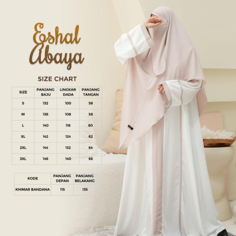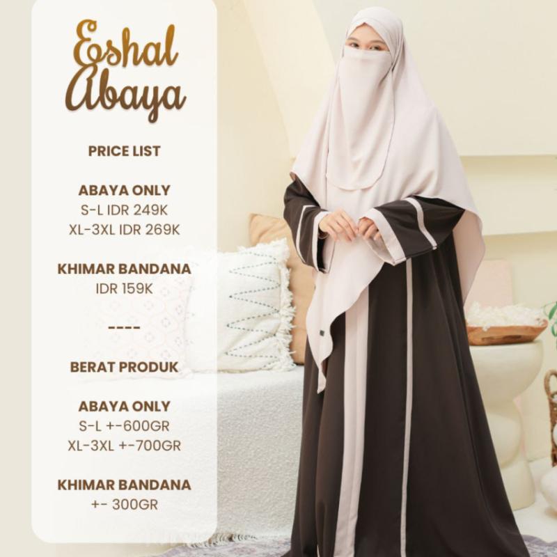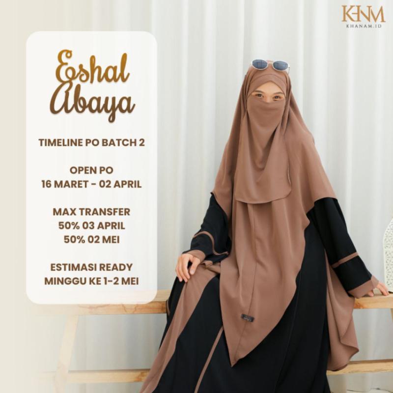 Bismillah.. Daily Abaya terbaru dari Khanam, exclusive, simple & elegance.. *Eshal Abaya* Terbuat dari material Marina Silk, yang bertekstur lembut, dingin, jatuh, tidak menerawang & tidak mudah kusut. Eshal Abaya bisa dimix dengan Khimar Bandana antem yang super nyaman ?? *Free cadar untuk setiap pembelian Khimar Bandana* *Available in 4 Colors* * Black mix Milo * Cream mix Brown * BW mix Cream * Brown mix Cream *JADWAL PRE ORDER BATCH 2* •Open PO : 16 Maret - 02 April •Batas Transfer : 50% 03 April 50% 02 Mei •Estimasi ready Minggu ke 1-2 Mei *SPESIFIKASI ABAYA* *Material Marina Silk yang lembut, halus, jatuh, dingin, tidak mudah kusut & super nyaman *Kerah Shanghai *Resleting depan (busui friendly) *Terdapat List Vertikal di bagian depan yang menambah kesan lebih jenjang & elegan *Cutting loss abaya tanpa sambungan badan *Manset tangan semi abaya, wudhu friendly dengan list yang super cantik *Saku kanan *Lebar bawah 2,5 - 2,8m *SPESIFIKASI KHIMAR BANDANA* *Material Marina Silk yang lembut, halus, jatuh, dingin, tidak mudah kusut & super nyaman *Detail bagian atas wajah khimar terdapat tali bandana yang bisa diikat ke luar atau ke dalam (2 style) *Desain khimar runcing untuk memudahkan aktifitas *PRICELIST* *ABAYA ONLY* S - L IDR 249k XL - 3XL IDR 269k *KHIMAR BANDANA Free Cadar IDR 159k*