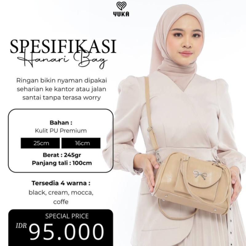 YUKA ? HANARI BAG FREE SLING BAG Tas elegan dengan sentuhan aksesoris pita gold yang manis & classy ? Cocok untuk daily look maupun acara semi formal. ? Spesifikasi Produk : • Nama Produk : Hanari Bag • Ukuran : 25 x 16 cm • Bahan : Kulit PU Premium • Tali : ?– Tali jinjing ?– Tali panjang ±105 cm (bisa lepas pasang) • Aksesoris : Gold hardware bentuk pita • Detail : Pocket di bagian depan tas ? Pilihan Warna : Black, Coffee, Cream, Mocca