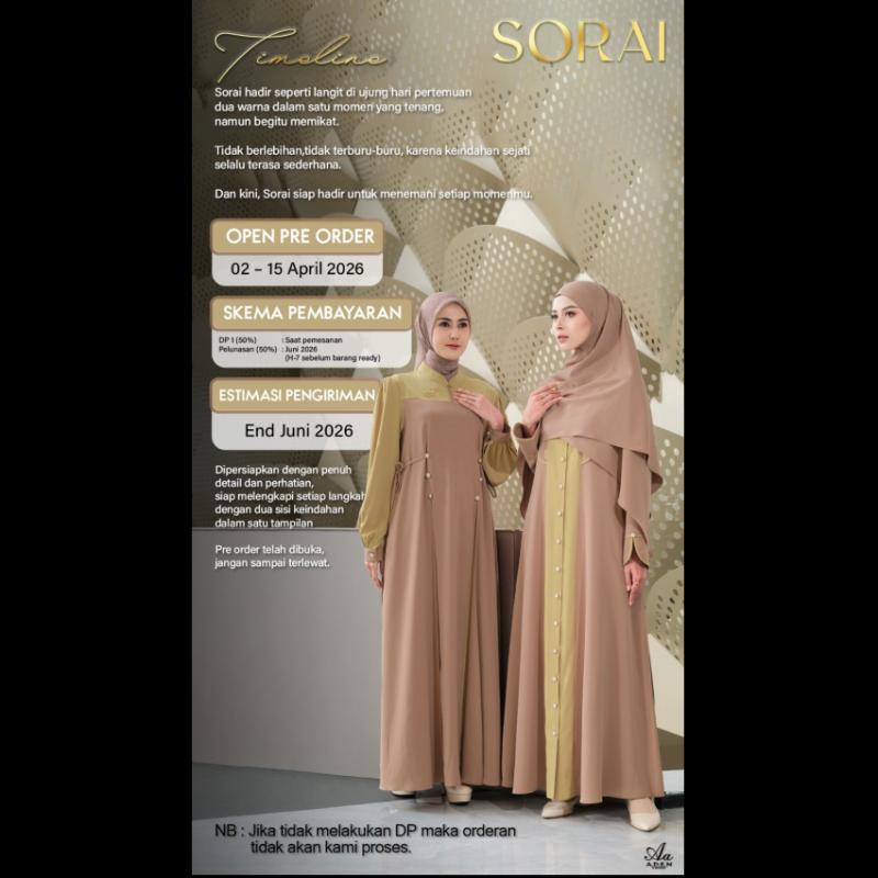 ? ? SORAI DRESS @a.d.e.n_hijab ? Harmony in every shade ? Open Pre-Order: 02 –15 APRIL 2026 Sorai adalah tentang pertemuan dua keindahan dalam satu momen. Lembut, tenang, namun tetap memikat. Sebuah dress yang hadir untuk setiap sisi dirimu— simple, atau statement, keduanya tetap elegan ? ? Material Produk ? Revenna Tekstur halus, lembut, adem, flowy, dan tidak nerawang. ? Ayana Voal Tekstur halus, ringan, lembut, dan nyaman dipakai. ?Detail Produk ?  DETAIL — STYLE 1 - Dirancang dengan sentuhan detail yang memperkuat kesan classy: - Krah shanghai - Bukaan kancing full sampai bawah - Lengan lurus - Detail manset dengan list & kancing hias - Layer di bagian depan dress - Saku di sebelah kanan - Metal tag ADEN di bagian depan dress ?  DETAIL — STYLE 2 - Dirancang dengan sentuhan feminin yang lebih statement: - Krah shanghai - Bukaan resleting depan (front zipper) - Variasi potongan pada bagian depan dress - Detail kancing & tali pita di sisi kanan dan kiri - Aksen lipit hadap di bawah kancing - Lengan balon - Manset dengan bukaan kancing - Saku di sebelah kanan - Metal tag ADEN ? DETAIL SCARf - Material: Ayana Voal - Desain motif eksklusif by @a.d.e.n_hijab - Ukuran: 115 x 115 cm - Finishing: Laser titik tiga (rapi & tahan lama) - Metal tag “Aa” di salah satu ujung scarf - Packaging scarf only: Soft Box ? DETAIL KHIBBAN (HIMAR BANDANA) - Khimar 1 layer menggunakan bahan Revenna yang lembut & flowy ? - Desain segitiga dengan layer panjang di bagian belakang, memberikan tampilan anggun ? - Dilengkapi tali bandana yang dapat diikat ke belakang, praktis dan stylish - Terdapat detail metal tag ADEN pada tali bandana sebagai aksen eksklusif ? ? DETAIL UMUM ? Pilihan Warna ? Black ? Butter Cream ? Choco Latte ? Mulberry ? Teal ?? AVAILABLE ITEMS - Dress Only (Style 1 & Style 2) - Scarf Only - Khibban Only - Set Scarf (Style 1 & Style 2) - Set Khibban (Style 1 & Style 2) ? Available Size: XS – XXL ? Pricelist : Cek di @a.d.e.n_hijab ? Packaging Dress / Set ? Goodie Bag Eksklusif Scarf Only ? Soft Box #soraidress #soraibyadenhijab #adenhijab #dressadenhijab #denayustyle #dresscantik #outfitmuslimah #dressmuslimah #ootdhijabstyle